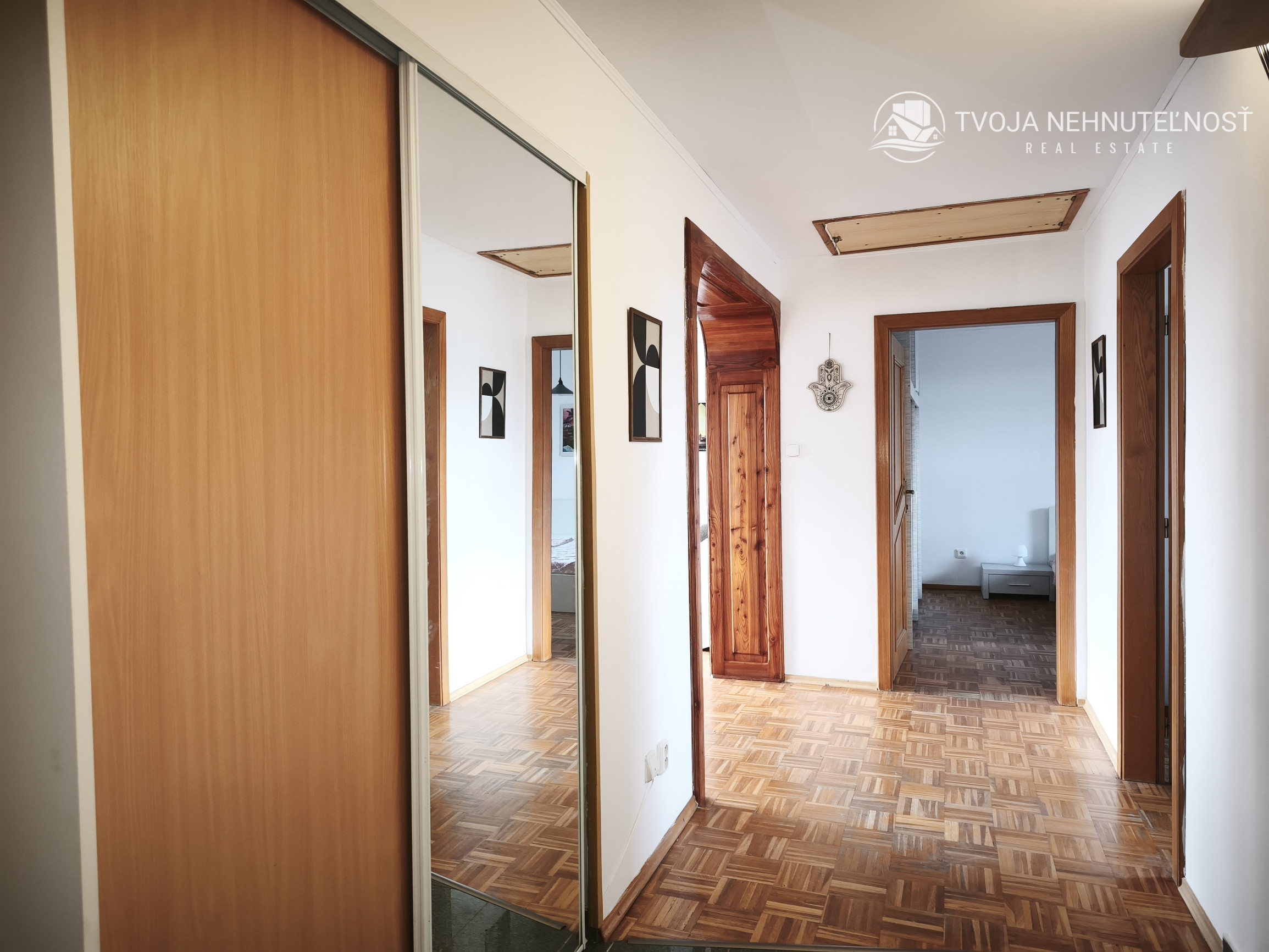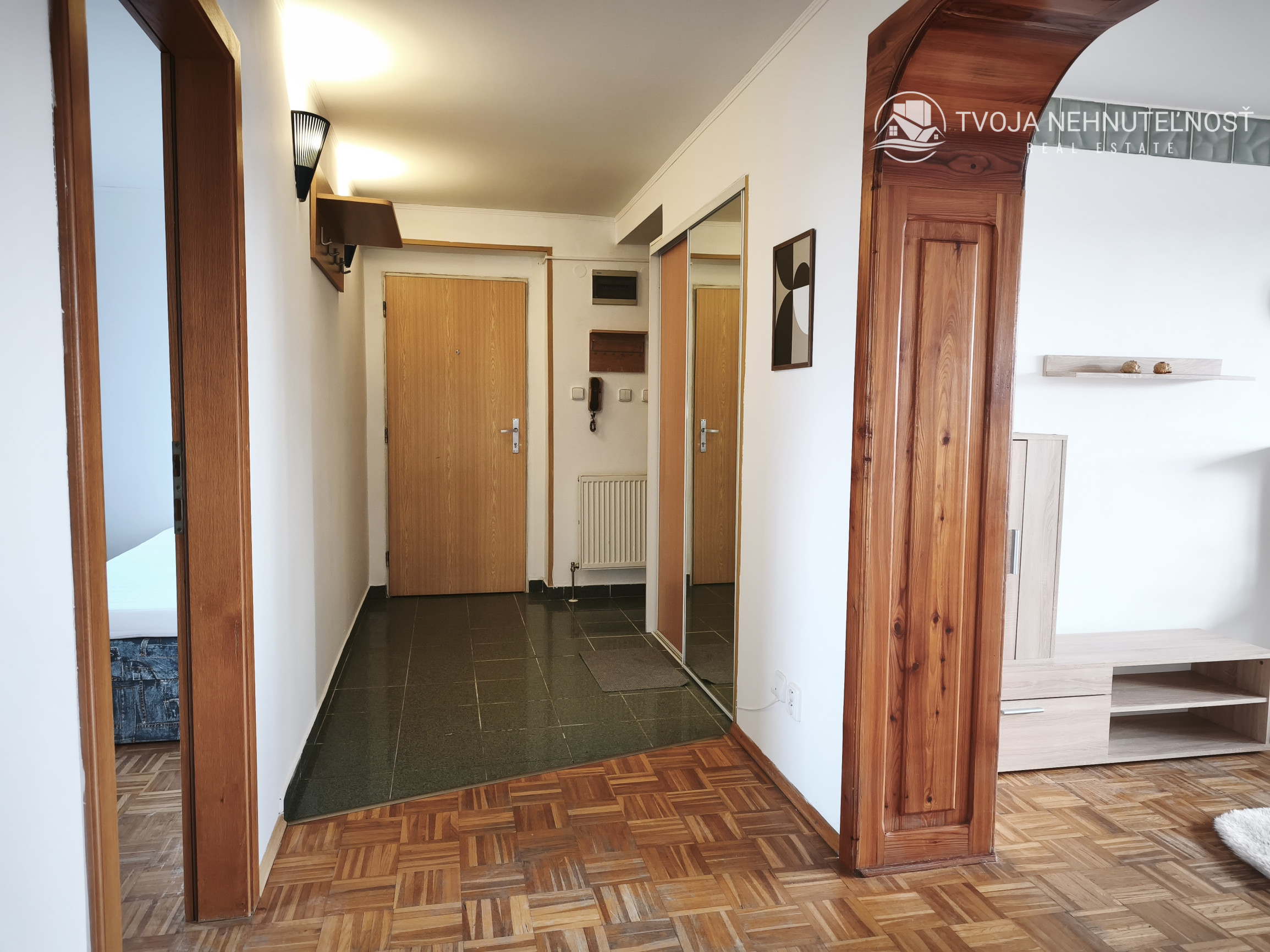 Z predsiene bytu so vstavanou skriňou vstupujeme do otvoreného priestoru - vľavo obývačka prepojená s kuchyňou, rovno spálňa, vpravo ďalšia izba.